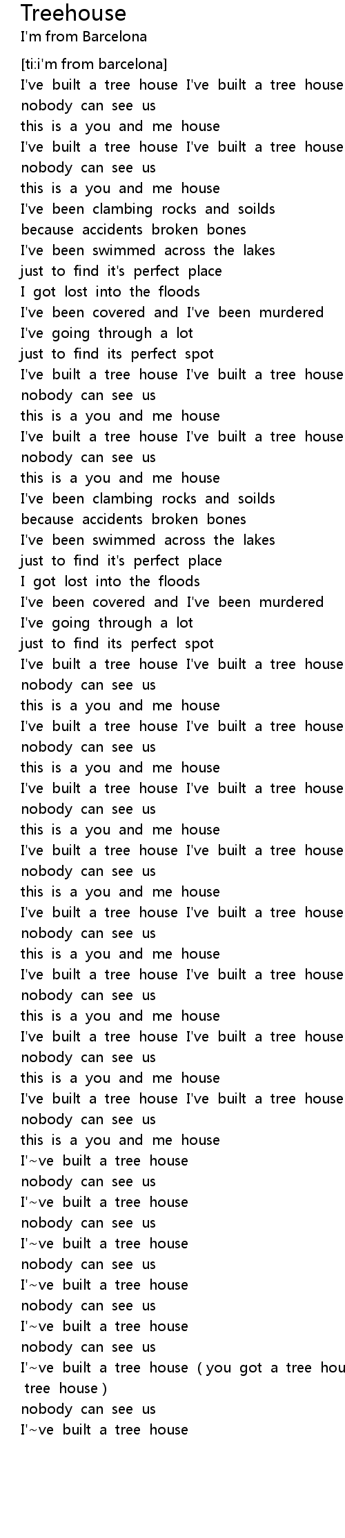 | [04:36.890] | I' ve built a tree house you got a tree house tree house tree house |