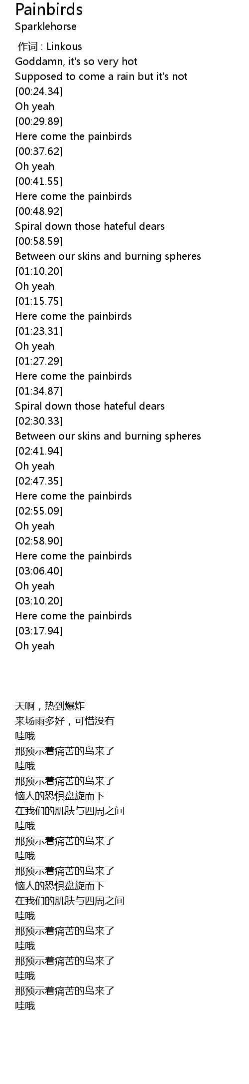 | [00:33.44] | Here come the painbirds |