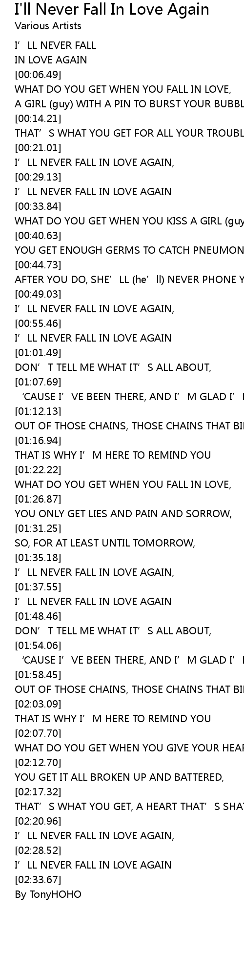 | [02:29.07] | I' LL NEVER FALL IN LOVE AGAIN |