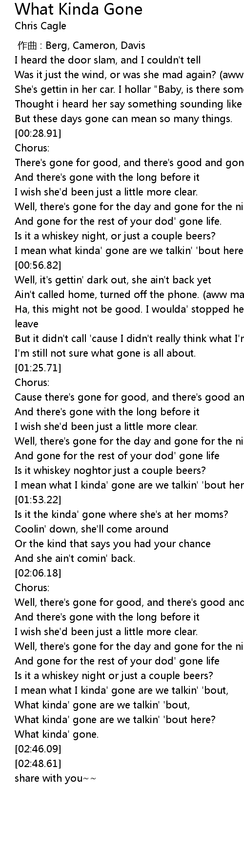 | [00:20.37] | Thought i heard her say something sounding like " i' m gone". |