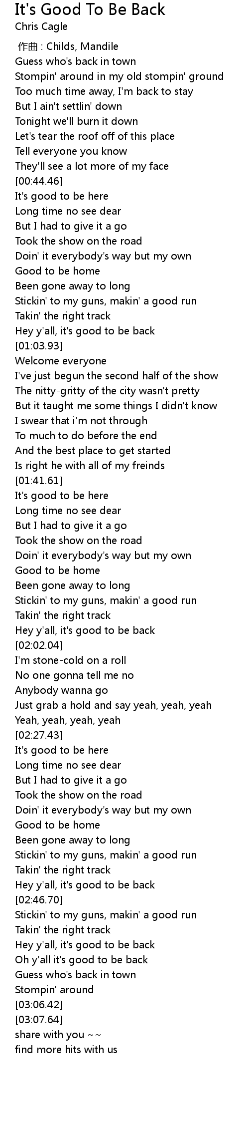 | [02:44.38] | Hey y' all, it' s good to be back |