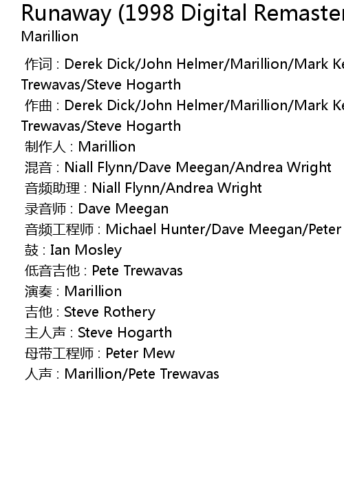 | [00:00.000] | 作词 : Derek Dick/John Helmer/Marillion/Mark Kelly/Peter Trewavas/Steve Hogarth |
