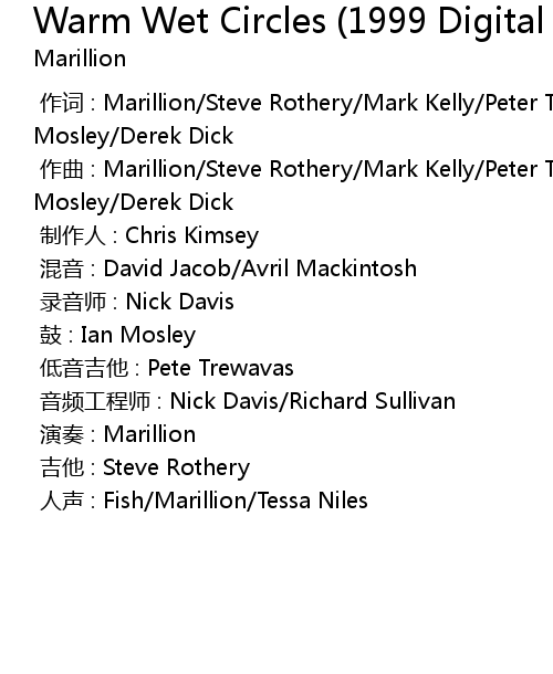 | [00:00.000] | zuo ci : Marillion Steve Rothery Mark Kelly Peter Trewavas Ian Mosley Derek Dick |