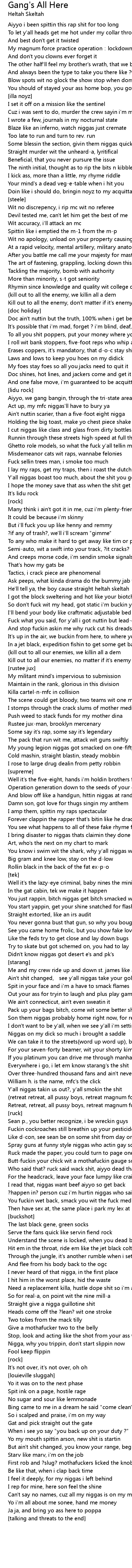 | Aiyyo, we gang bangin, through the tri-state area | |