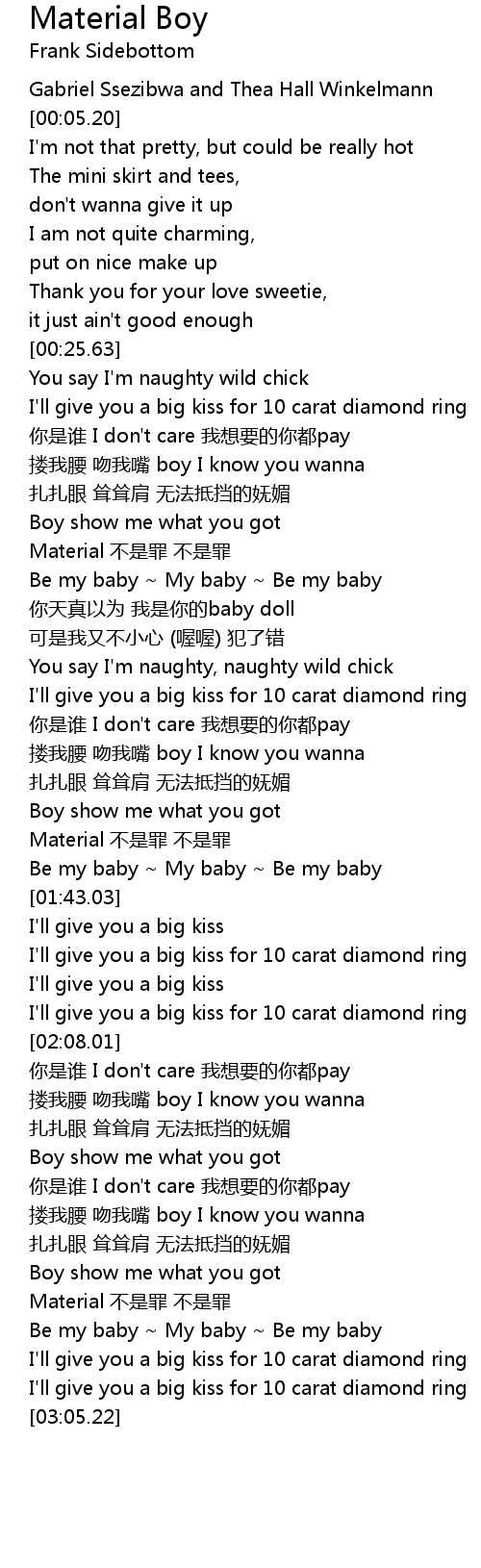| [02:03.52] | I'll give you a big kiss for 10 carat diamond ring |
