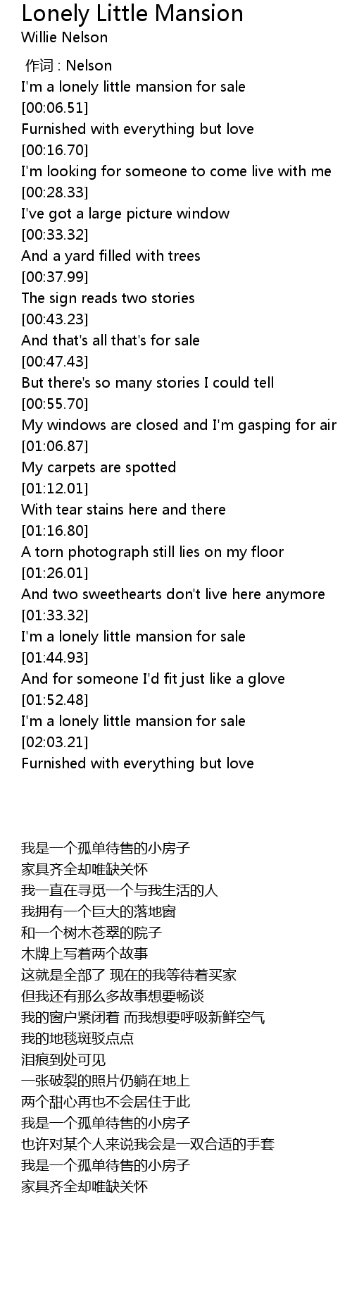 | [01:56.47] | I' m a lonely little mansion for sale |