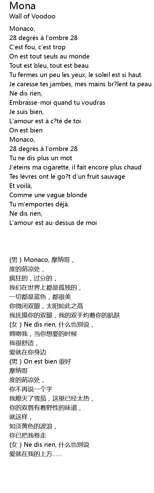 | [00:48.760] | Je caresse tes jambes, mes mains br? lent ta peau. |
