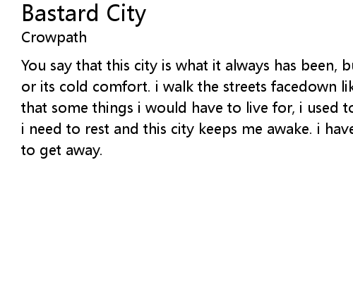 | You say that this city is what it always has been, but i can't recall its smell or its cold comfort. i walk the streets facedown like everyone else. you told me that some things i would have to live for, i used to swallow every word. but now i need to rest and this city keeps me awake. i have waited, but no more. i need to get away. |