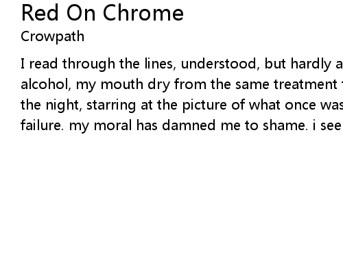 | I read through the lines, understood, but hardly agreed. my mind soaked in alcohol, my mouth dry from the same treatment the day before. drinking through the night, starring at the picture of what once was a great man, now one great failure. my moral has damned me to shame. i see no other way out, red on chrome. |
