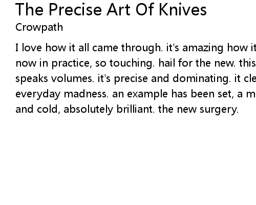 | I love how it all came through. it's amazing how it aims on the target. a dream now in practice, so touching. hail for the new. this bizarre, violent creation speaks volumes. it's precise and dominating. it clears a path through the everyday madness. an example has been set, a map to follow. it's infinite, hard and cold, absolutely brilliant. the new surgery. |