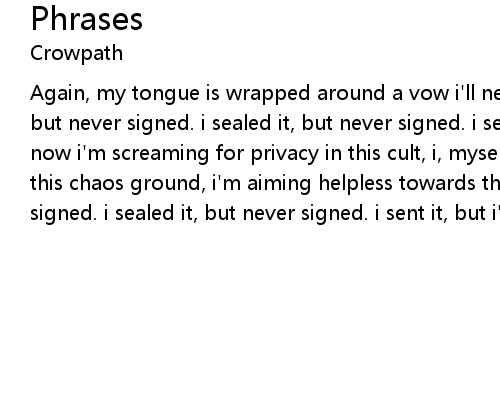 | Again, my tongue is wrapped around a vow i'll never be able to keep. i wrote it, but never signed. i sealed it, but never signed. i sent it, but never signed. now i'm screaming for privacy in this cult, i, myself created. another mile on this chaos ground, i'm aiming helpless towards the blank. i wrote it, but never signed. i sealed it, but never signed. i sent it, but i'll never sign. |