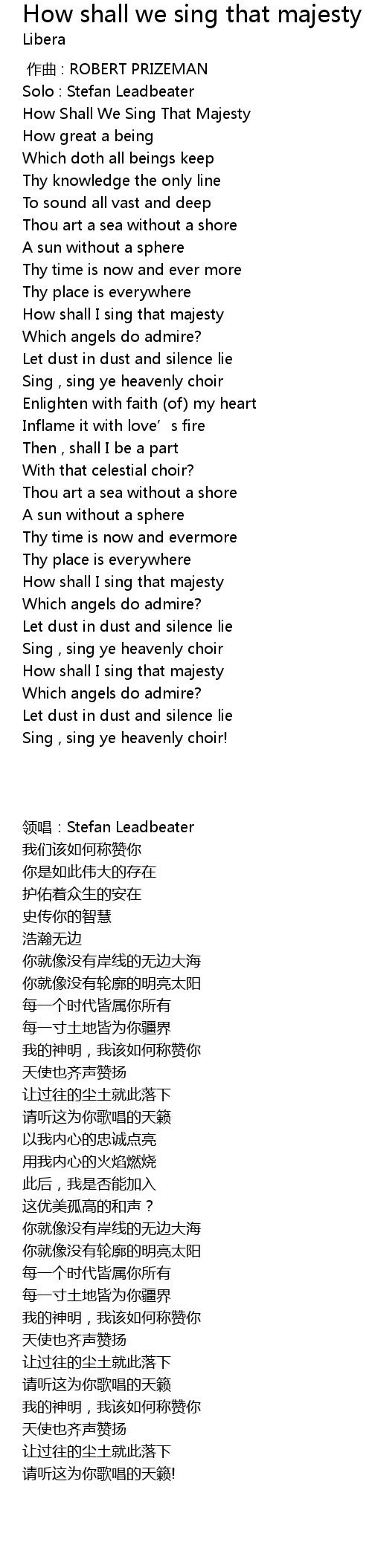 | [00:10.92] | How Shall We Sing That Majesty |