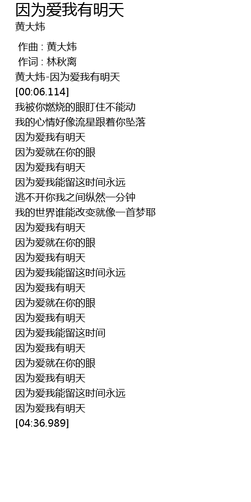 | [00:02.805] | 黄大炜-因为爱我有明天 |