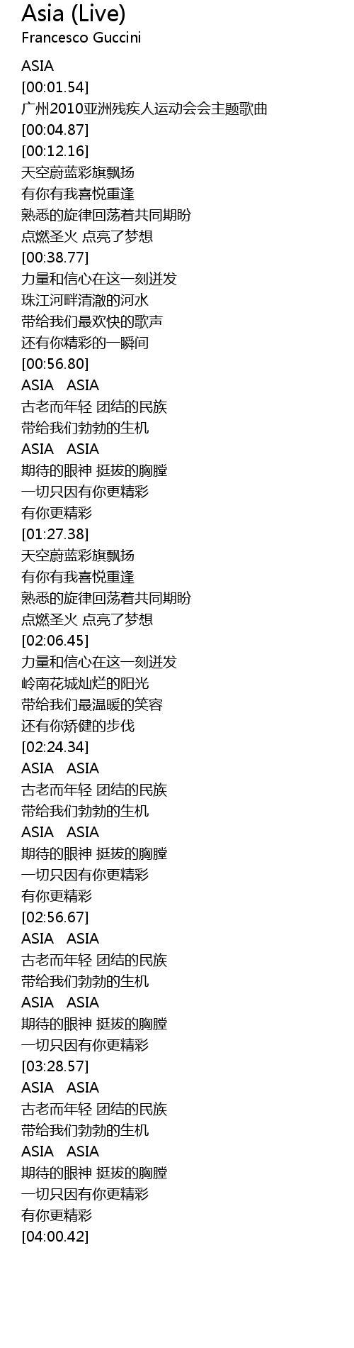 | [00:03.33] | 广州2010亚洲残疾人运动会会主题歌曲 |
