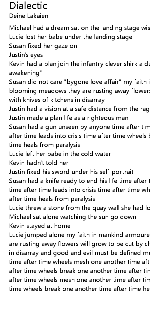 Lucie jumped alone my faith in mankind armoured caskets in blooming meadows they are rusting away flowers will grow to be cut by children with knives of kitchens in disarray and good and evil must be defined must be denied fall into decay time after time wheels mesh one another time after time leads into crisis time after time wheels break one another time after time heals from paralysis time after time wheels mesh one another time after time leads into crisis time after time wheels break one another time after time heals from paralysis |