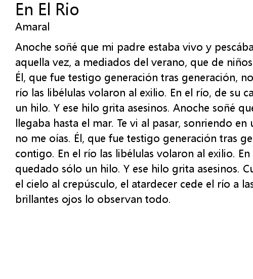| Anoche soé que mi padre estaba vivo y pescá bamos juntos en el rí o. Como aquella vez, a mediados del verano, que de ni os nos baá bamos en el rí o. É l, que fue testigo generació n tras generació n, no verá a mis hijos. En el rí o las libé lulas volaron al exilio. En el rí o, de su cauce ha quedado só lo un hilo. Y ese hilo grita asesinos. Anoche soé que nadando rí o abajo yo llegaba hasta el mar. Te vi al pasar, sonriendo en una orilla. Te llamaba pero no me oí as. É l, que fue testigo generació n tras generació n, é l se fue contigo. En el rí o las libé lulas volaron al exilio. En el rí o, de su cauce ha quedado só lo un hilo. Y ese hilo grita asesinos. Cuando el sol se hunde y cede el cielo al crepú sculo, el atardecer cede el rí o a las lucié rnagas. Miles de brillantes ojos lo observan todo. |