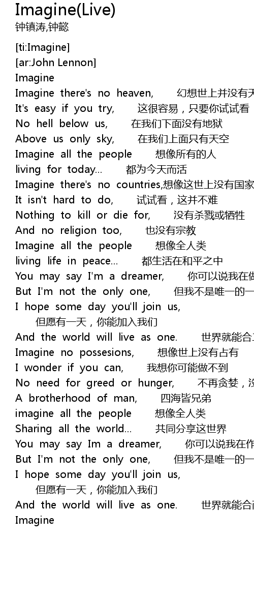 | [01:15.08] | Imagine all the people 想像全人类 |