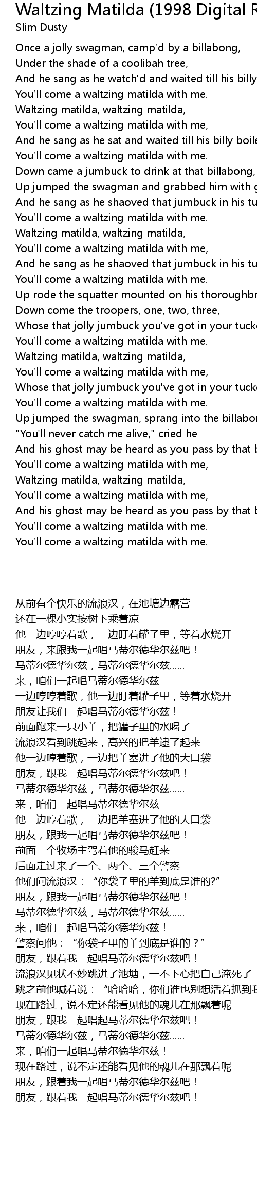 | [01:17.49] | You ll come a waltzing matilda with me. |