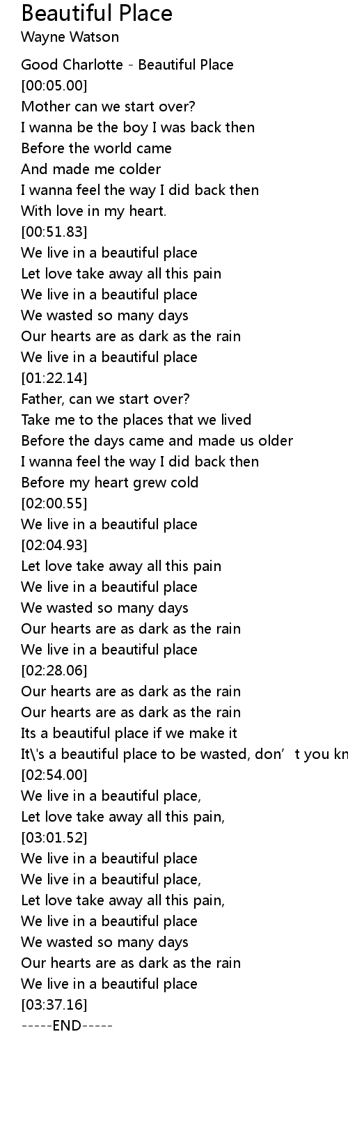 | [00:00.00] | Good Charlotte - Beautiful Place |