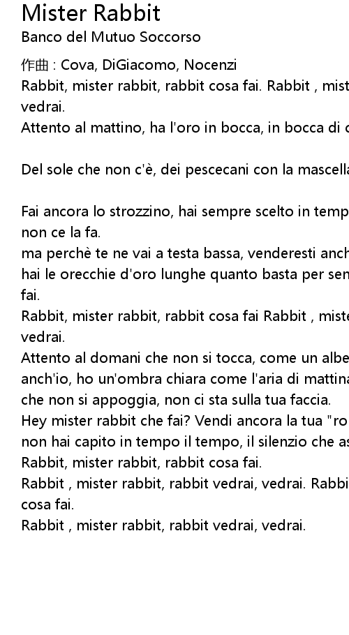 | Rabbit, mister rabbit, rabbit cosa fai. Rabbit , mister rabbit, rabbit vedrai, vedrai. | |