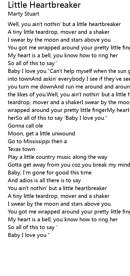 Baby I love you."Can't help myself when the sun goes down,Thinkin' 'bout you, go into townAnd askin' everybody I see if they've seen youWell, you bring me, then you turn me downAnd run me around and around and aroundMy heart ain't ever seen the likes of you.Well, you ain't nothin' but a little heartbreakerA tiny little teardrop, mover and a shakerI swear by the moon and stars above you.You got me wrapped around your pretty little fingerMy heart is a bell, you know how to ring herSo all of this to say 'Baby I love you."