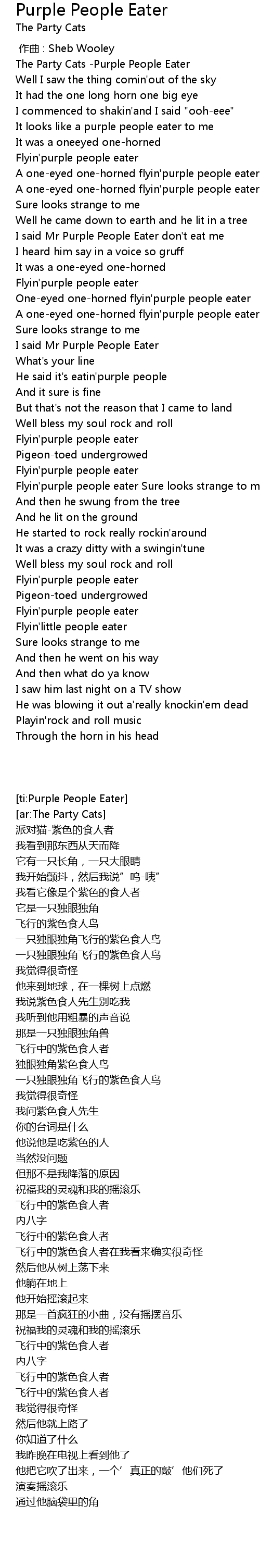 | [00:38.284] | I said Mr Purple People Eater don' t eat me |