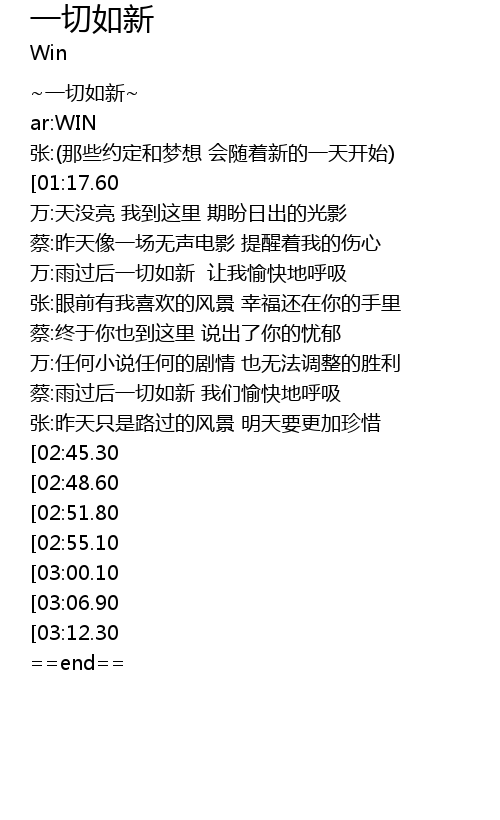 | [01:19.60][02:45.30][03:21.60] | WIN:牵我的手 跟着我走 |
