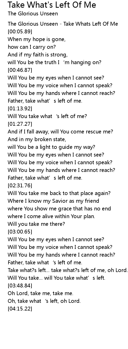 | [00:01.12] | The Glorious Unseen Take Whats Left Of Me |