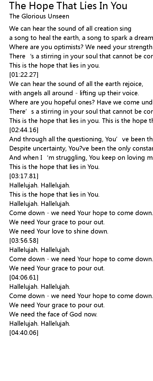 | [03:43.31] | Come down - we need Your hope to come down. |