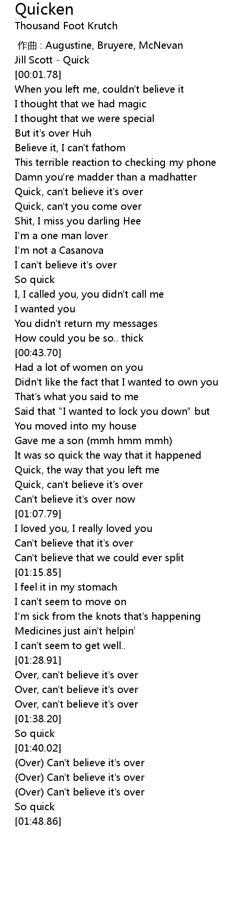 | [01:40.95] | (Over) Can't believe it's over |