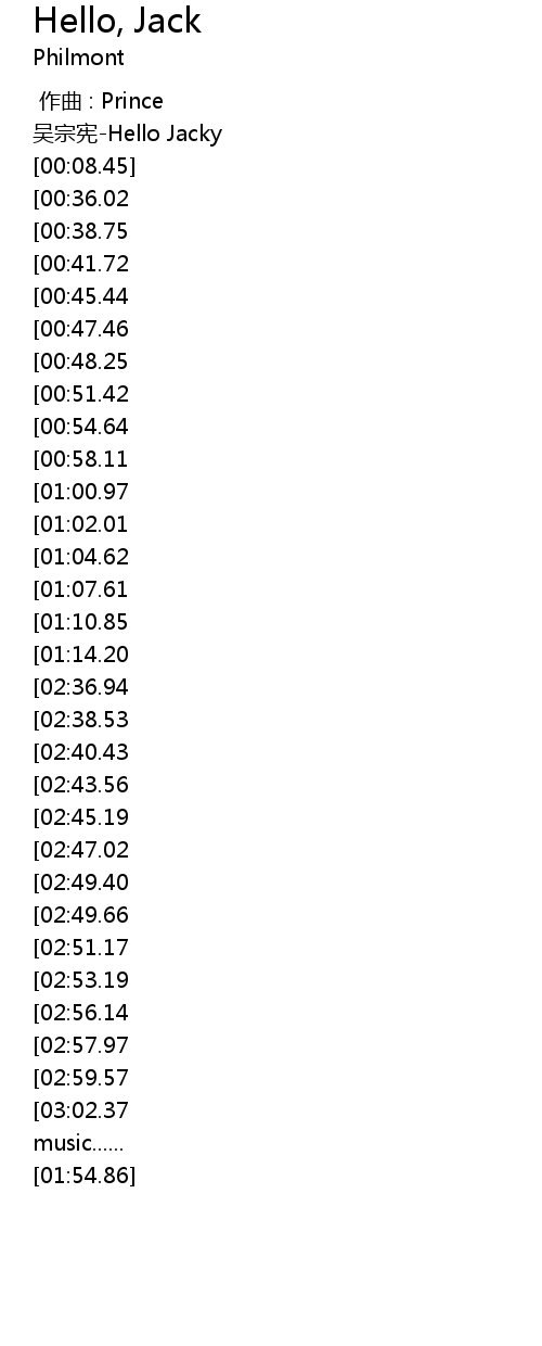 | [03:32.78][02:49.66][01:27.97] | Hello Jacky |