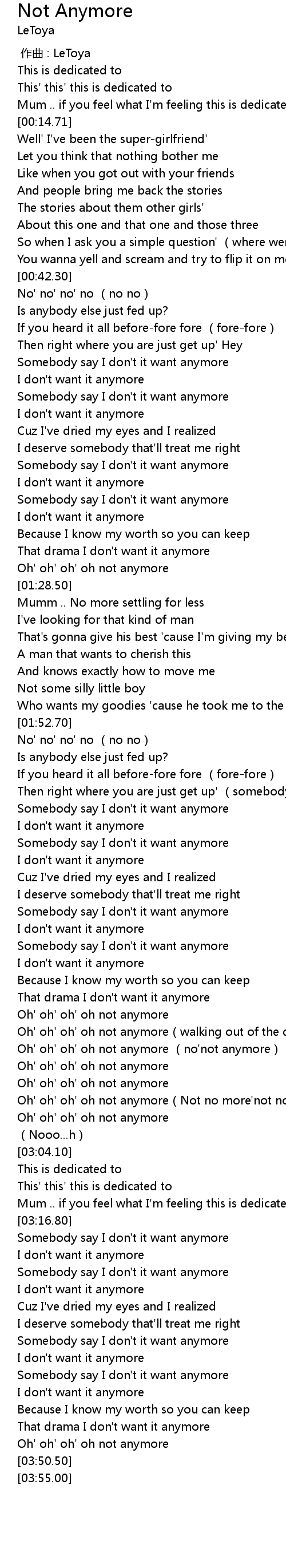 | [02:53.64] | Oh' oh' oh' oh not anymore Not no more' not no more' I m gone |