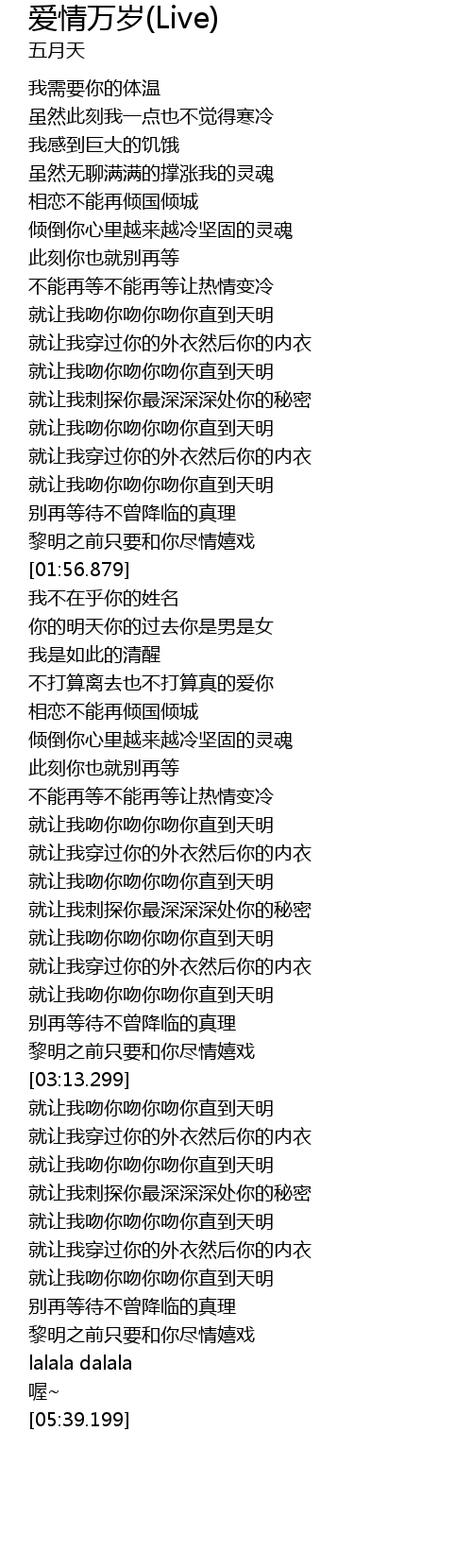 | [04:38.299] | jiù ràng wǒ wěn nǐ wěn nǐ wěn nǐ zhí dào tiān míng |