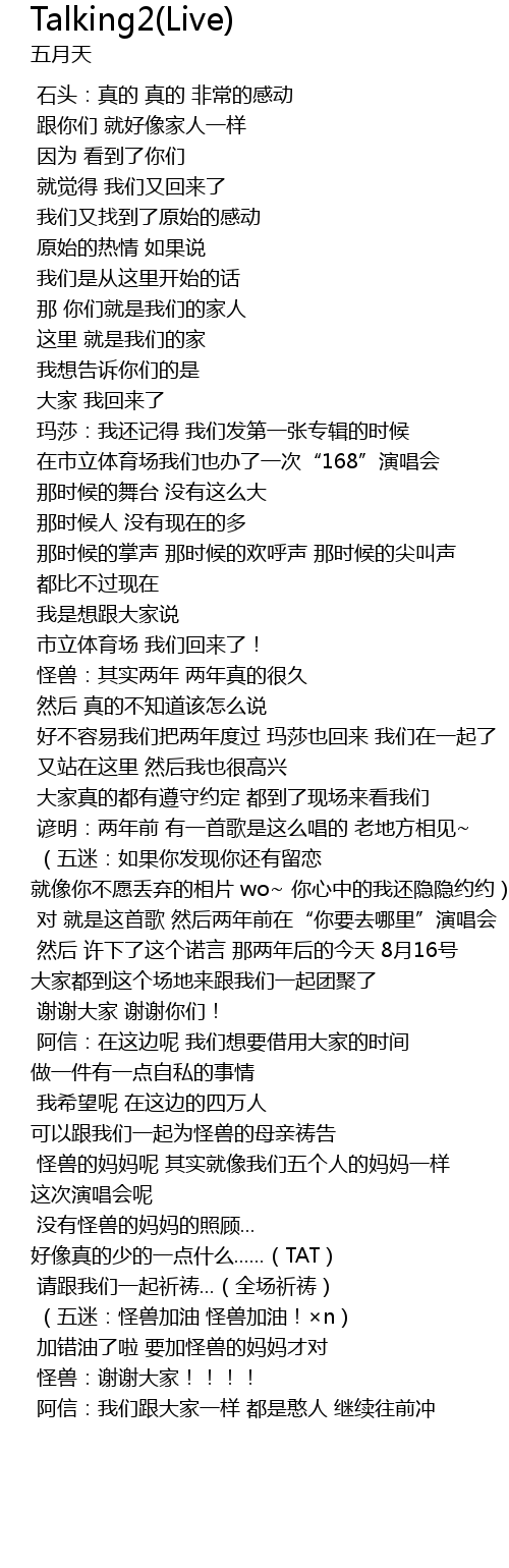 | [03:55.777] | 怪兽的妈妈呢 其实就像我们五个人的妈妈一样 这次演唱会呢 |