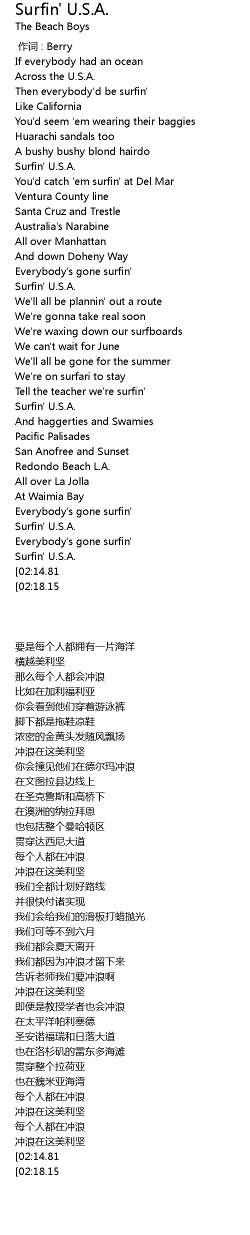 | [02:21.05][02:14.81][02:09.32][02:03.10] | Everybody's gone surfin' |