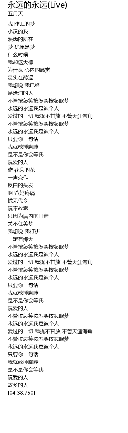 | [03:38.750] | yǒng yuǎn de yǒng yuǎn wǒ shì bǐ gè rén |