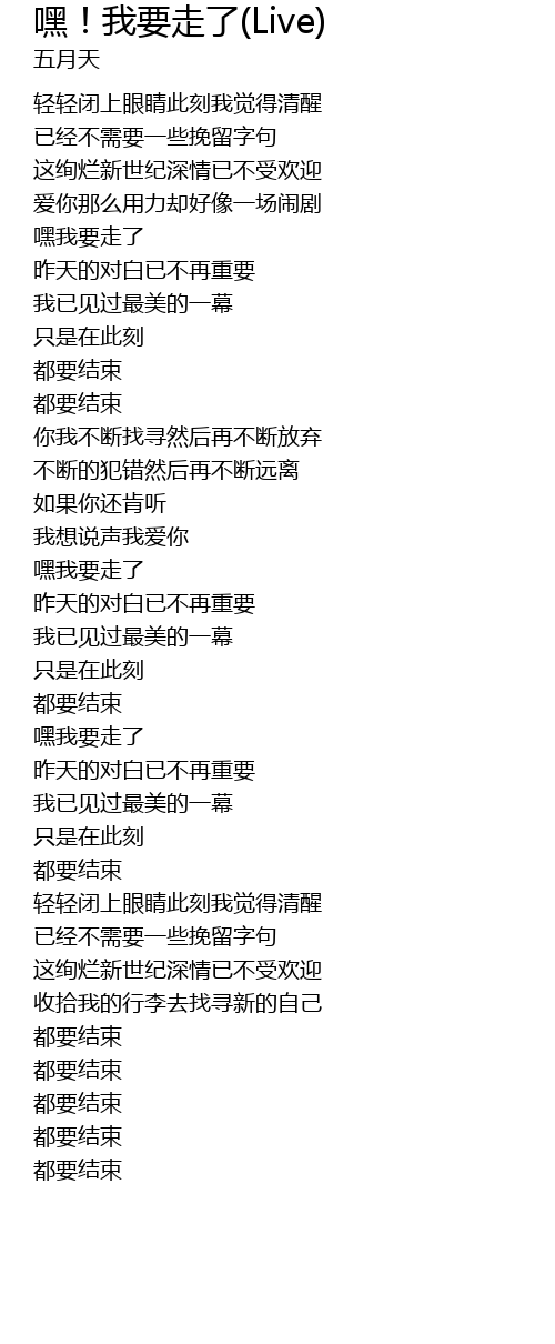 | [00:56.608] | hēi wǒ yào zǒu le |