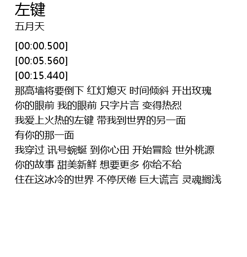 | [01:05.970] | 我穿过 讯号蜿蜒 到你心田 开始冒险 世外桃源 |