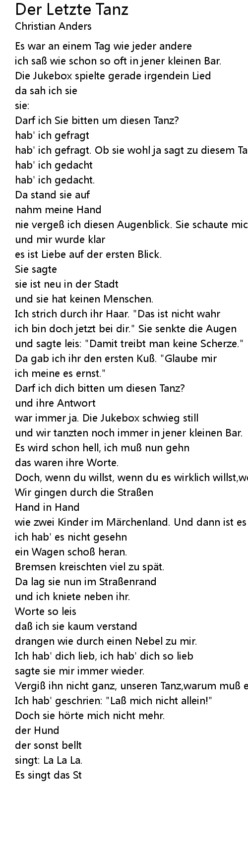 | Vergi ihn nicht ganz, unseren Tanz, warum mu er so zu Ende gehn? | |