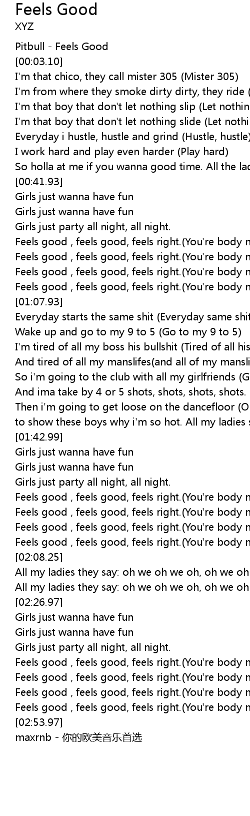 | [02:03.75] | Feels good , feels good, feels right.(You're body next to mine) |