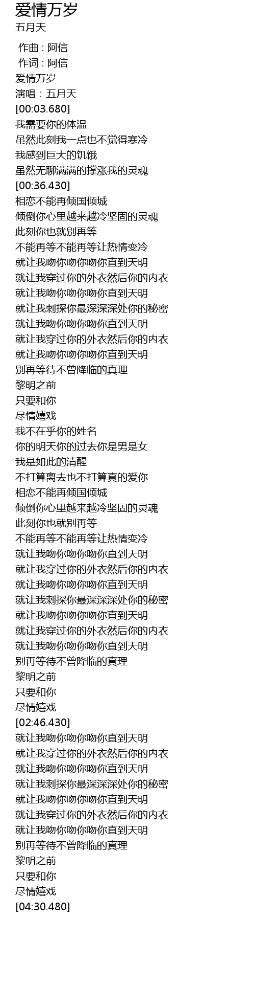 | [04:01.450] | jiù ràng wǒ wěn nǐ wěn nǐ wěn nǐ zhí dào tiān míng |