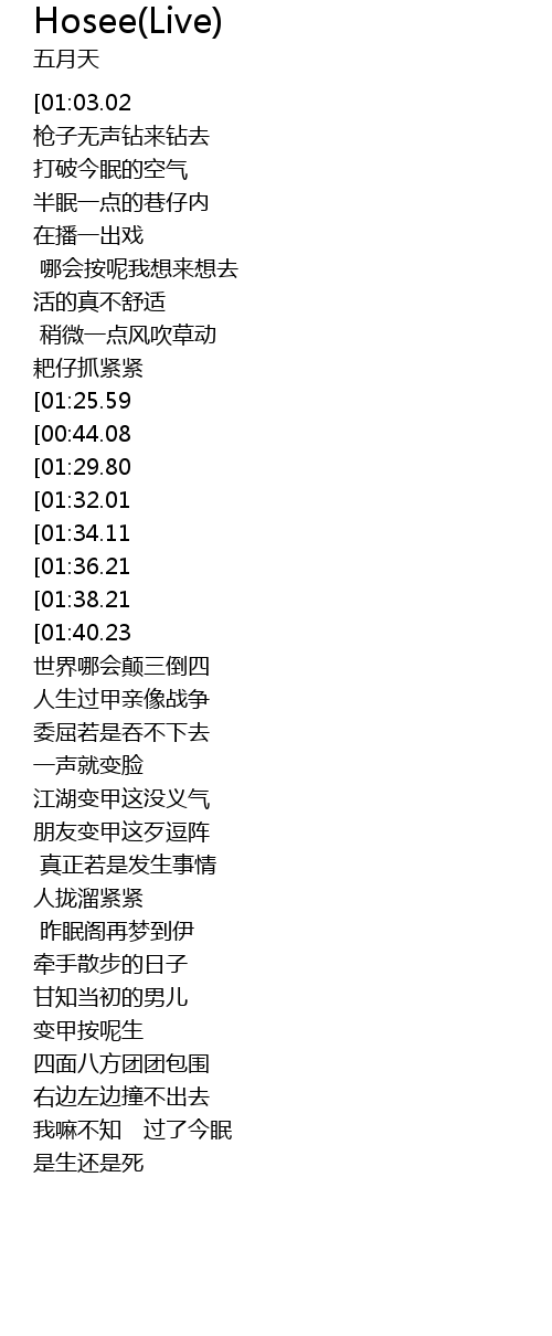 | [02:38.99][01:36.21][00:54.23] | HoSee HoSee hū yī sǐ |