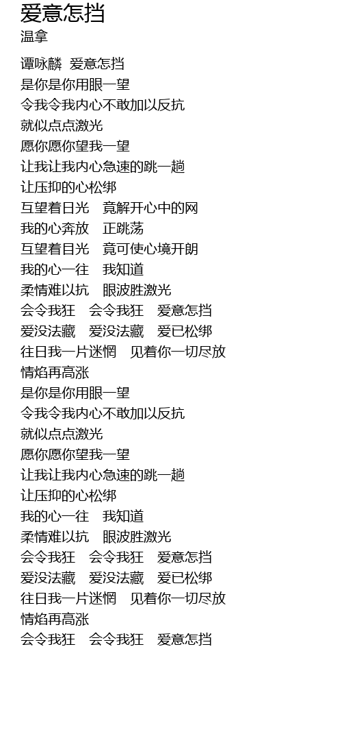 | [00:00.00] | 谭咏麟 爱意怎挡 |