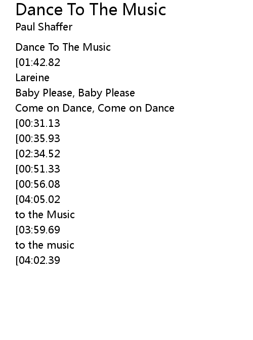 | [04:09.88][03:59.69][03:49.63][03:39.44][03:29.58][03:19.89][03:09.28][01:35.80][01:25.68][01:15.79] | Dance to the music |