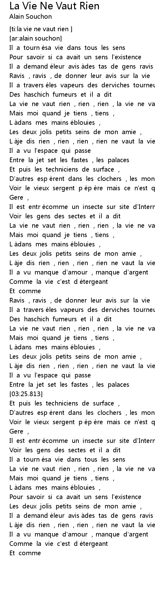 | [03:21.855] | La vie ne vaut rien ,rien ,rien ,la vie ne vaut rien |