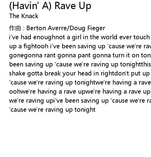 | i've had enoughnot a girl in the world ever touch your stuff so tightdon't put up a fightooh i've been saving up 'cause we're raving up tonighti'm blitzed i'm gonegonna rant gonna pant gonna turn it on tonightdo this thing up right oohi've been saving up 'cause we're raving up tonightthis place is deadgotta wake gotta shake gotta break your head in rightdon't put up a fight oohi've been saving up 'cause we're raving up tonightwe're having a rave upwe're having a rave up oohwe're having a rave upwe're having a rave up oohi've been saving up 'cause we're raving upi've been saving up 'cause we're raving upi've been saving up 'cause we're raving up tonight |