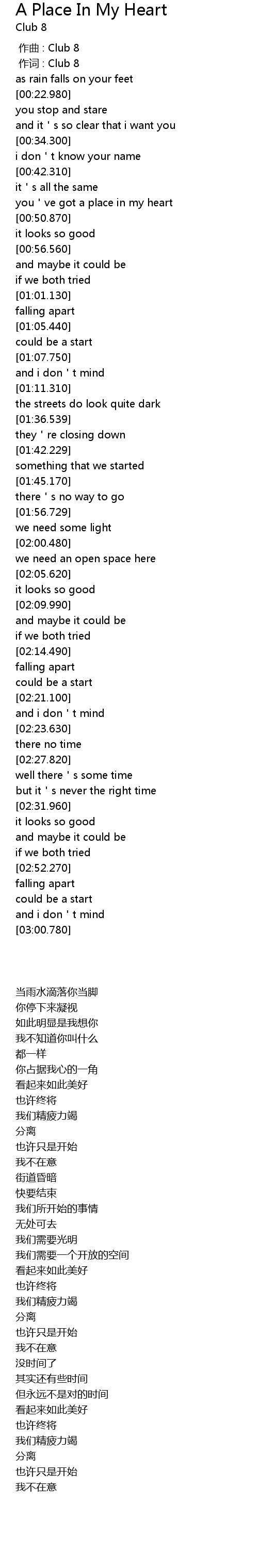 | [00:01.00] | 作词 : Club 8 |