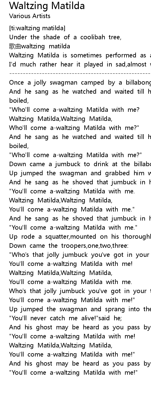 | [01:03.701] | "You'll come a-waltzing Matilda with me." |
