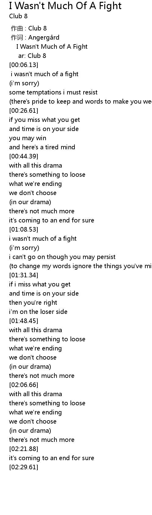 | [00:00.43] | I Wasn' t Much of A Fight |