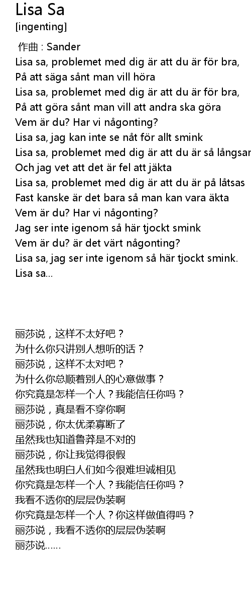 | [00:35.44] | Lisa sa, jag kan inte se n t f r allt smink |